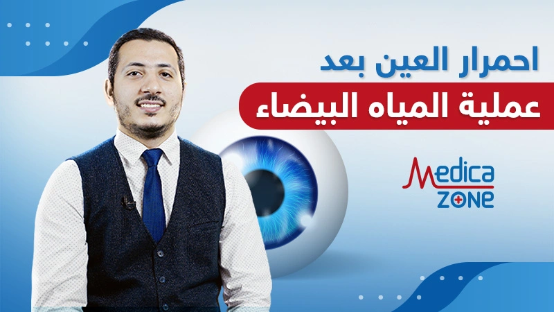 يُفزع احمرار العين بعد عملية المياه البيضاء أغلب المرضى الخاضعين للجراحة، وهو عَرَض يظهر في صورة بضع نقاط دموية في العين، وينتج عن التهاب العين بعد الجراحة، أو تكَسُر الشعيرات الدموية الصغيرة في أثناء إجراء الجراحة، وهي حالة يطلق عليها "نزيف ما تحت الملتحمة"، ويحتاج الجسم إلى حوالي ثلاثة أسابيع لامتصاص هذا الدم، واختفاء هذا الاحمرار تمامًا.